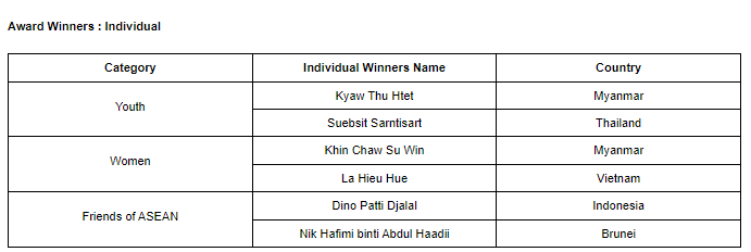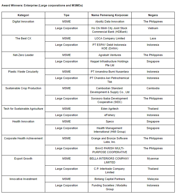 Berikut adalah daftar peraih penghargaan ASEAN Business Awards 2023 :